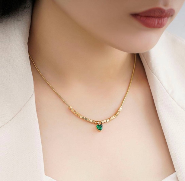 زنجیر ماری یک میل با گوی های مکعبی متحرک و نگین قلبی شکل کریستالی سبز رنگ که جلوه و زیبایی خاصی به آن بخشیده و زیبایی آن را دوچندان کرده است. استیل درجه یک مناسب استفاده ی دائم و بهترین کیفیت موجود دربازار می باشد.